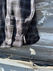 生地はコットン・シルクのグレーチェック。繊維くずをネップにしたノイル生地となりますので、生地の写真を見るとわかりますが独特な凹凸感のある古着のような生地感となります。