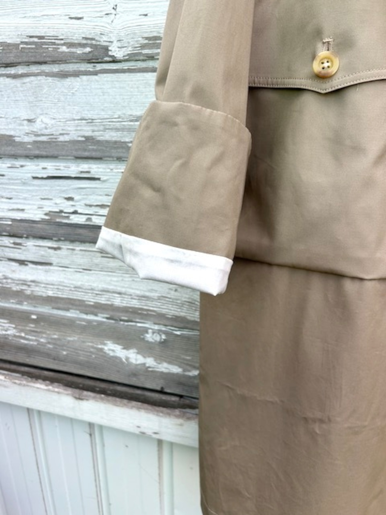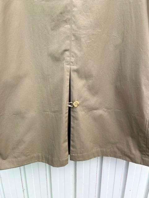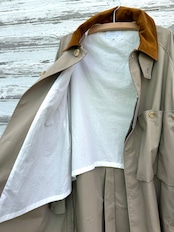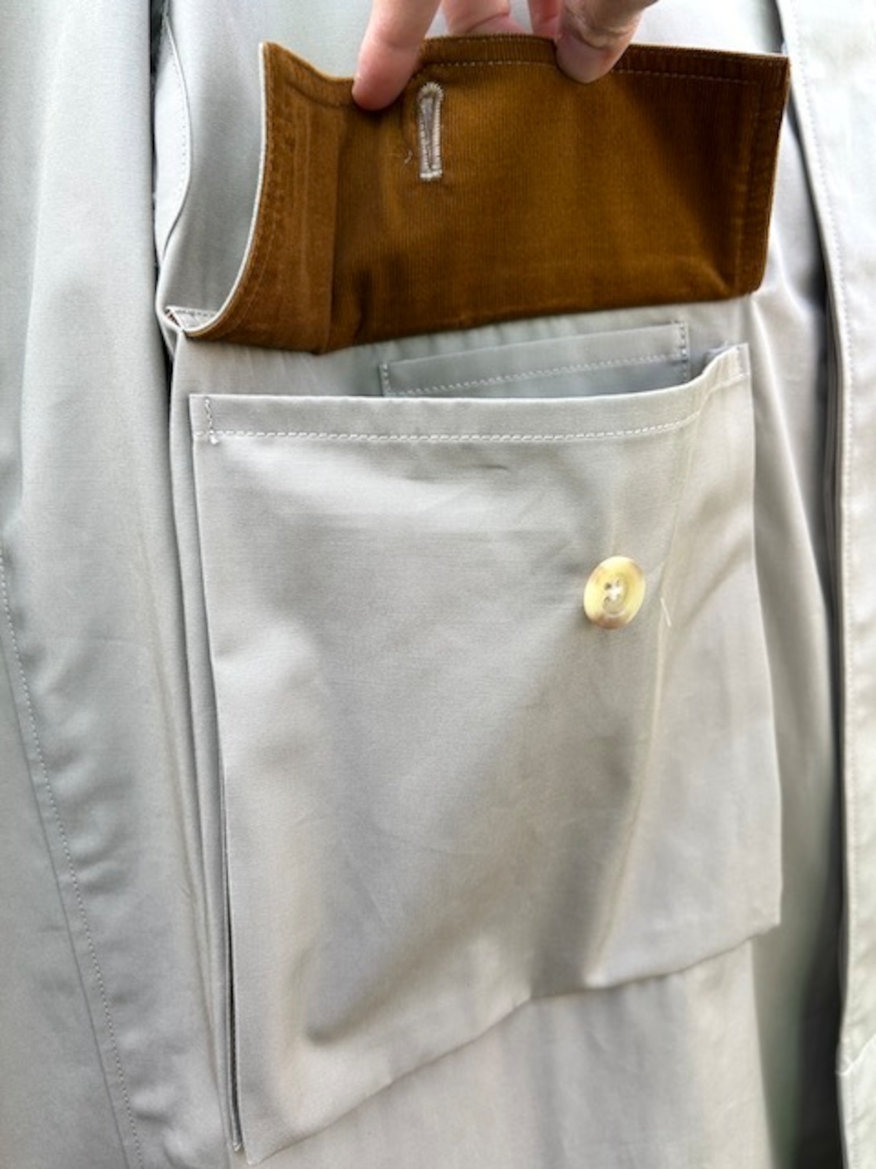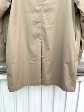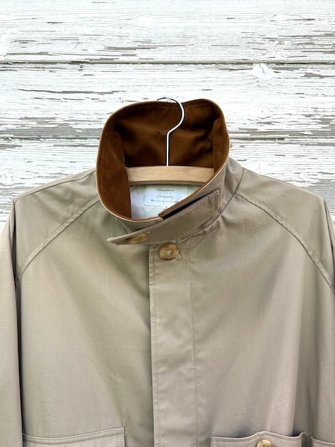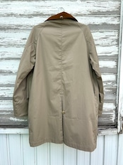 素材は、撥水加工を施した高密度なコットンギャバジン。生地感はとてもクラシックな見え方のする雰囲気です。コットン100%素材ですが、やや軽めのしなやかな質感の生地となりますますので、このコートの軽やかさは失われません。