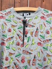 辛さのあるアイテムが散りばめられたプリントT。袖は切り替えでスミクロ。3つボタンのヘンリーネック仕様です。
