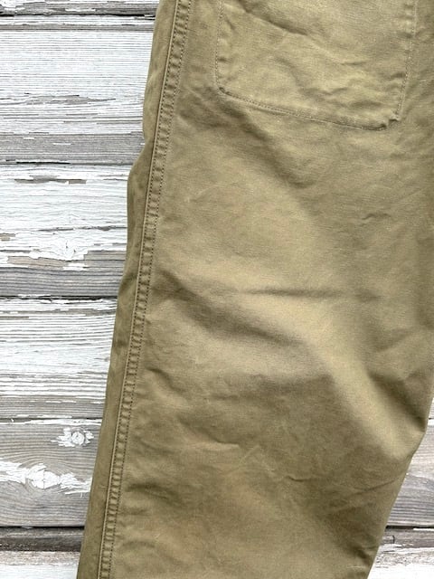 生地はコットンポプリンの硫化染め。高密度で乾いた質感の肌触り、色味もドライな感じのカーキグリーンという印象。最初からアタリも楽しめる仕上がりです。