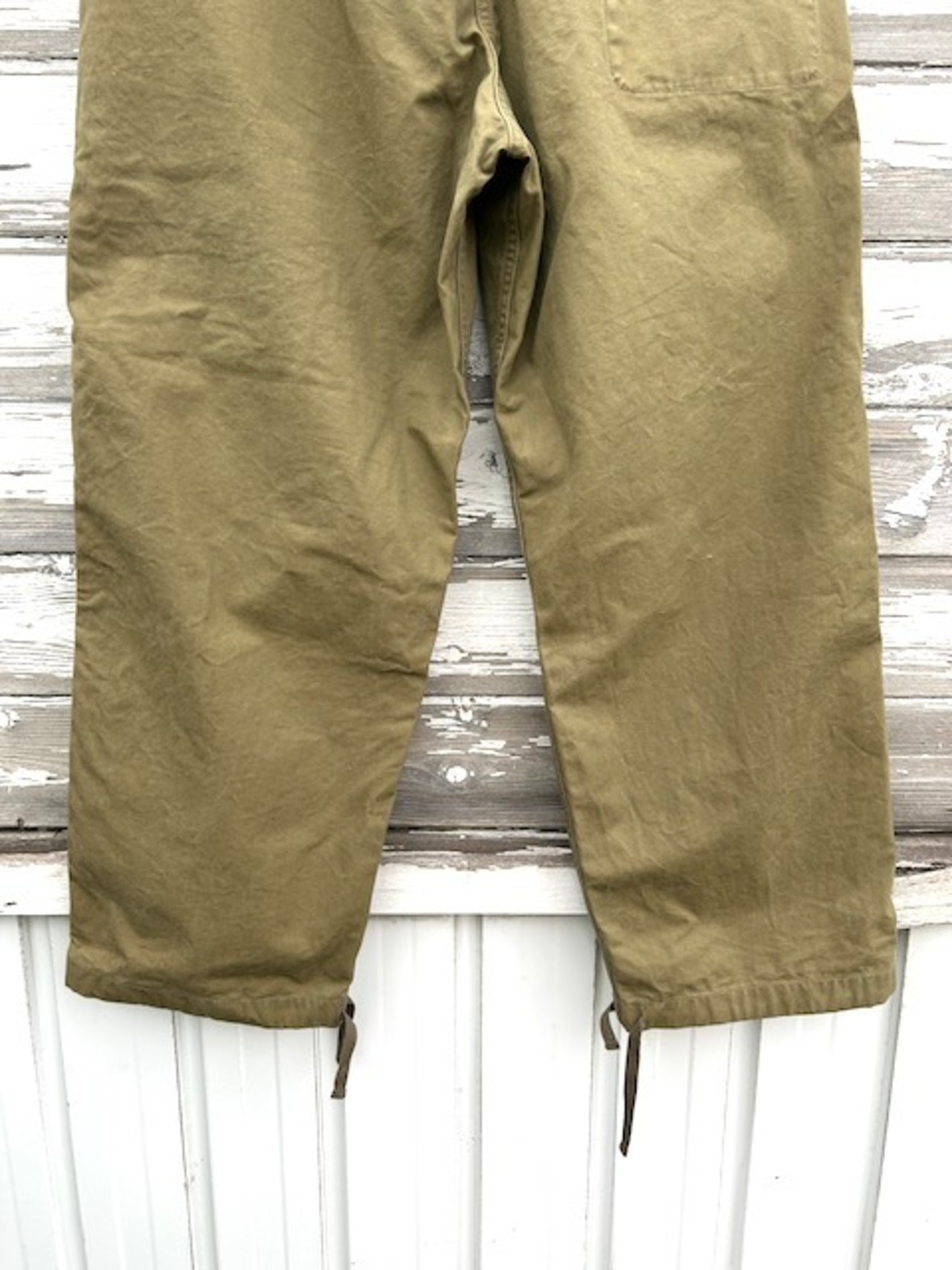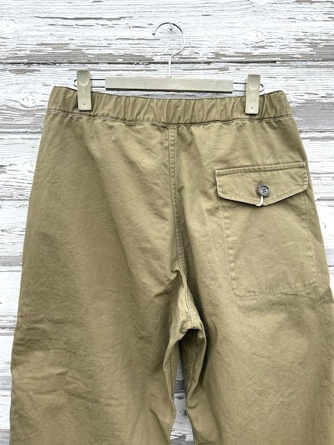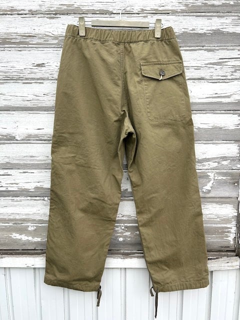 ウエストはヒモで調整が可能なイージー仕様。各サイズありますが通常のパンツに比べるとウエストのサイズはシビアではないのでシルエット重視で穿いていただけます。