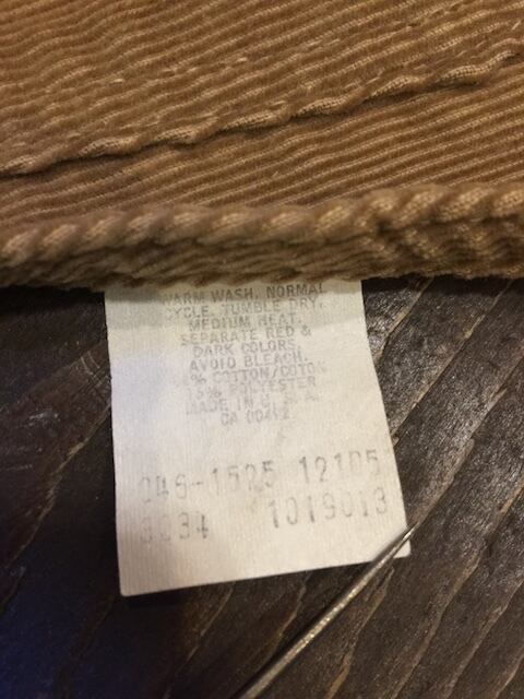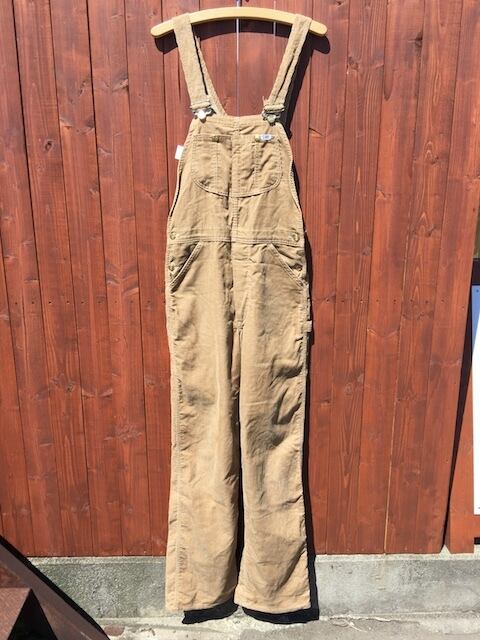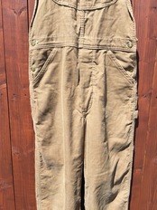 推定70年代、Leeのコーデュロイオーバーオールです。アメリカ製。ピスネーム R.MR入り・バックポケット右内側にユニオンチケット付き。金具 Lee刻印入りのオリジナルです。裾もオリジナルの長さでダメージ無し、全体を見てもコーデュロイの潰れもありません。年代の割に、かなり状態は良好です。