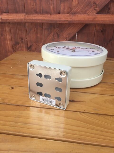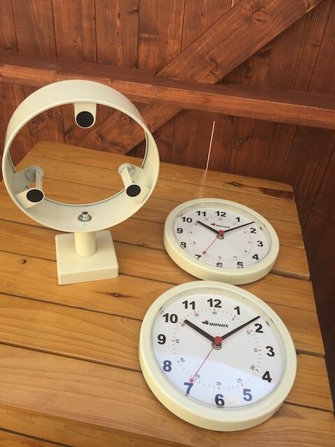 シンプルな雰囲気の中に、赤色の秒針がアクセントになっています。両面の時計はフレームのマグネットで固定されているので取り外し取り付けが簡単なので、電池交換も楽々です。