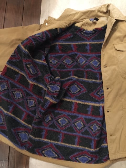 90年代に発売されたパタゴニアの名作、ヌエボレンジコートです。総裏でフリース仕様のカバーオール型。身頃裏は特徴的な柄のフリース、袖裏は無地のフリース仕様となります。ボタンもパタゴニアのロゴが刻まれたデザインで、随所に良さのある1枚です。