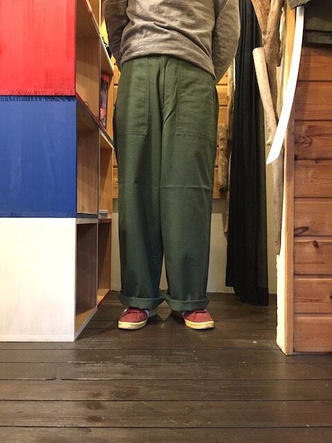 70年代のデッドストックのコシのある生地を使用し、履きこむほどに経年変化も楽しめるファティーグパンツです。