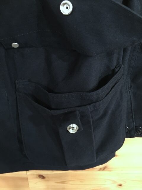 コットン地で微起毛のモールスキン生地を使用し、フロントにはゲームポケット、左右にはマチ付きで内側に仕切りのあるフラップポケットを配したハンティングジャケット。