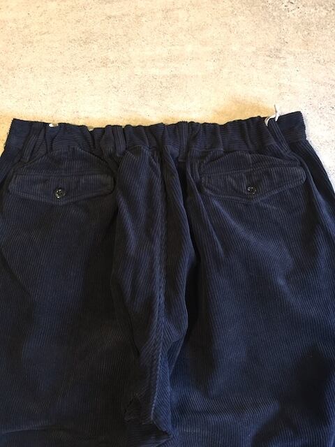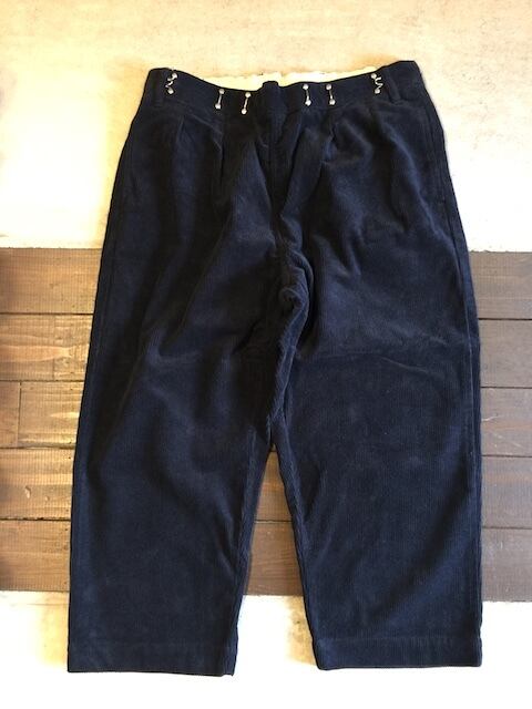 1960年代のフランス軍のチノトラウザーのシルエットをサンプリングし、ウエストはリベットフックで2段階の調整が可能。後ろはゴム仕様です。生地は太畝で少し光沢感のあるコーデュロイ素材。股上は深めのややテーパードの効いたワイドパンツですが、いろんなトップスと合わせやすいバランスの良いシルエットとなっております。