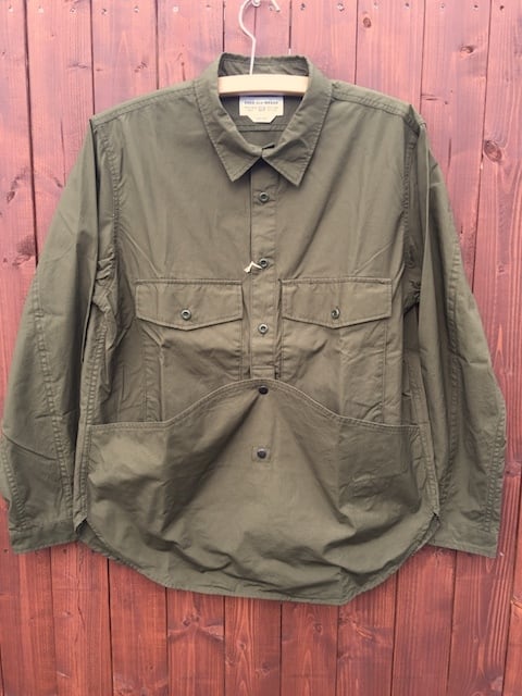 エンズアンドミーンズ定番のハーベストシャツ。プルオーバー仕様です。チンストラップとフロントのビッグポケットが特徴的なアイテム。ビッグポケットは2カ所スナップボタンで留めて着用可能。その内側にも2つのポケットがあります。胸ポケットはフラップ付きで両胸と、サイドからも手を入れられ、合計7つのポケットが付いています。