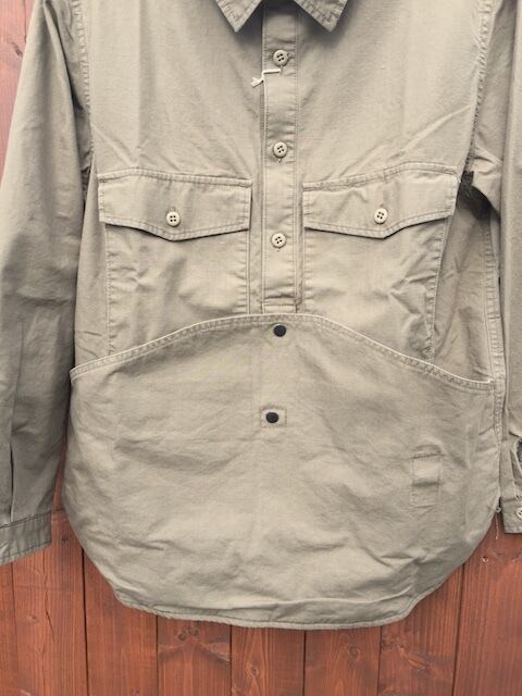 エンズアンドミーンズ定番のハーベストシャツ。プルオーバー仕様です。チンストラップとフロントのビッグポケットが特徴的なアイテム。ビッグポケットは2カ所スナップボタンで留めて着用可能。その内側にも2つのポケットがあります。胸ポケットはフラップ付きで両胸と、サイドからも手を入れられ、合計7つのポケットが付いています。