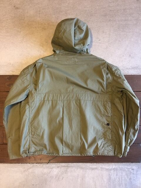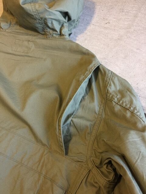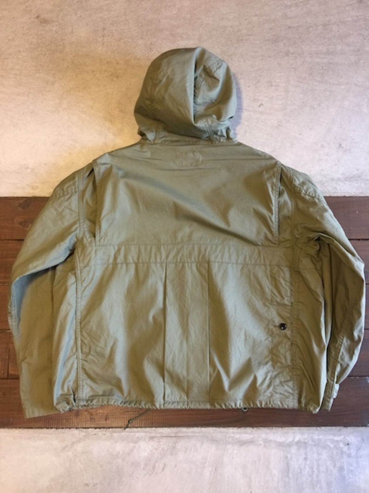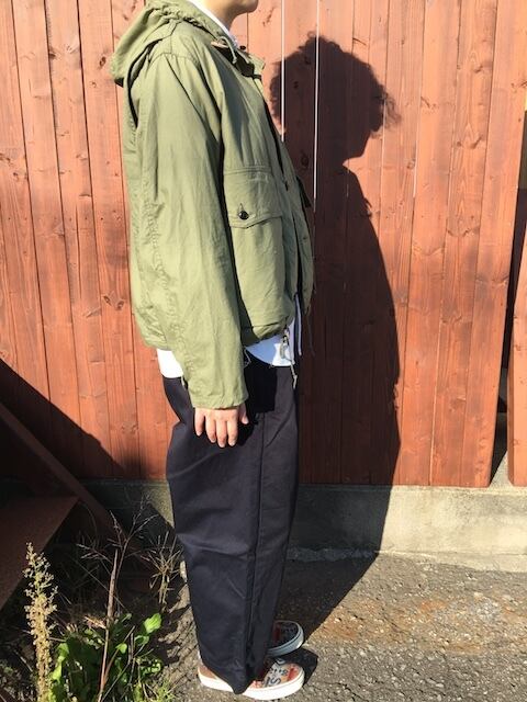 素材はVATDYEのアーミーオックス、革付属はヌメ革を使用して、ボタンは黒になります。短丈で幅広のBOXシルエット。ミリタリーベースではなくフィッシングジャケットがベースというところもポイントです。背中には右から手を入れれるバックポケットが付きます。