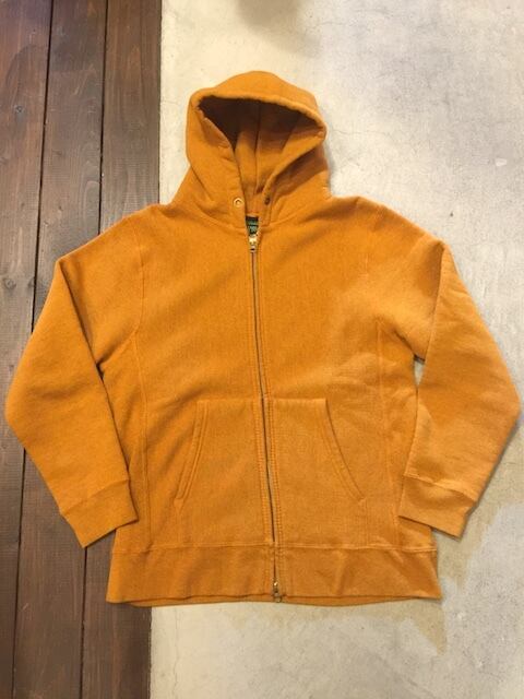 従来のスウェットパーカーとは異なり、着丈・身幅・袖丈をブラッシュアップし細身のシルエットに仕上がっています。ジップはダブル仕様です。裏地はサーマルではなく、起毛感の強いモフモフとした肌触り。色味は杢がかったオレンジ色で見かけない色味となっています。アメリカ製ならではの、ヘビーオンスの丈夫な質感はそのままです。