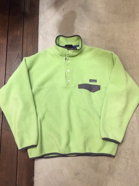98年製のシンチラスナップ Tプルオーバーです。毛足の短いフリースを使った保温性に優れた一着。フロントはナイロン製前立てに4つのスナップボタンが付き防風性を高めています。左胸にはナイロン製フラップにスナップボタンが付いたポケット付き。単体でもインナーとしても使えるフリースです。メキシコ製。あまり見かけない珍しいカラーリングだと思います。
