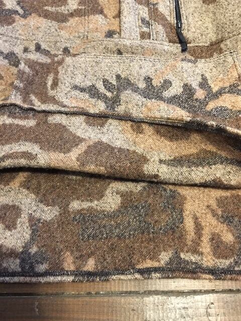 バージンウール90%、コットン10%の毛足の長い迷彩柄の生地を使用したP/Oジャケットです。ハーフジップにカンガルーポケット仕様。素材こそウールがメインですが、アノラックっぽい作りとなっています。両肘には同生地のエルボーパッチが付きます。