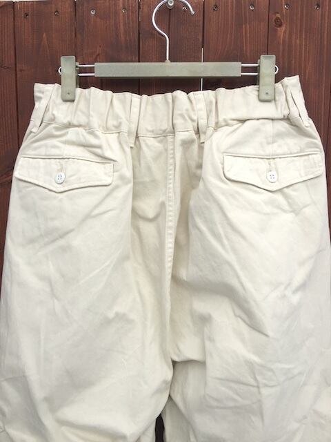 1960年代のフランス軍のチノトラウザーのシルエットをサンプリングし、ウエストはリベットフックで2段階の調整が可能。後ろはゴム仕様です。生地は打ち込みの多い、光沢感のあるコットン素材。股上は深めのややテーパードの効いたユニセックスのワイドパンツ。いろんなトップスと合わせやすいバランスの良いシルエットとなっております。