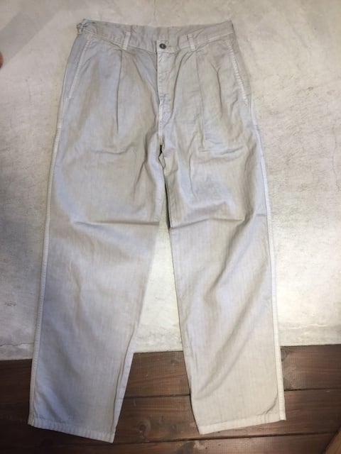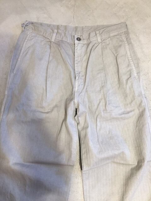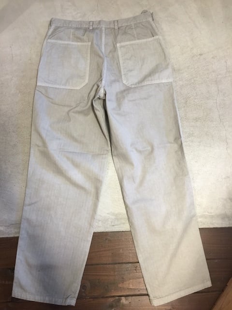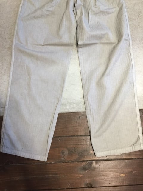 コットンヘリンボーン生地を使った新型のユニセックスパンツです。ステッチ周りはパッカリングが効いており、バックポケットは別生地を貼ったかのように見えるのが特徴的です。