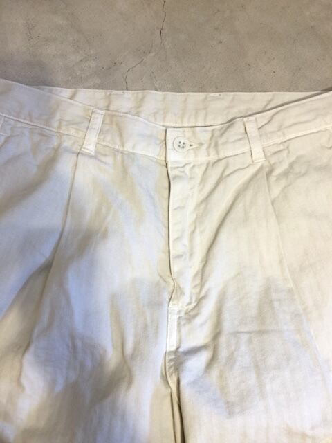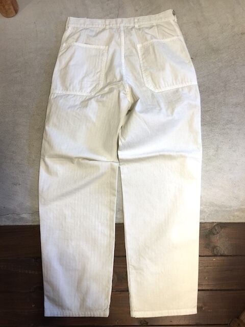 コットンヘリンボーン生地を使った新型のユニセックスパンツです。ステッチ周りはパッカリングが効いており、バックポケットは別生地を貼ったかのように見えるのが特徴的です。