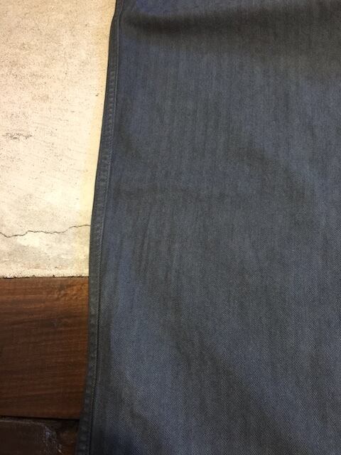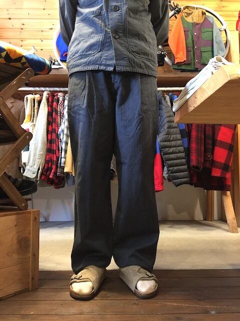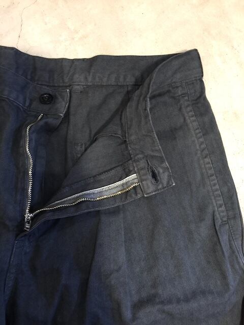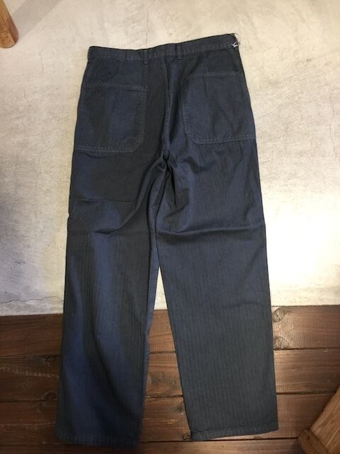 コットンヘリンボーン生地を使った新型のユニセックスパンツです。ステッチ周りはパッカリングが効いており、バックポケットは別生地を貼ったかのように見えるのが特徴的です。