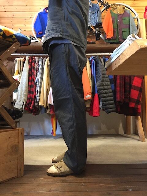 個人的に、ペインターパンツに近いシルエットに見えますが、ペインターほどワーク感が強くなく、スタイルを選ばない使い勝手の良いシルエットだと思います。 BLK色が一番加工感の出る色味となっています。