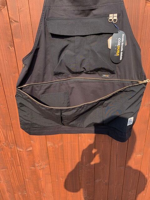 「1950念半ば、仕立て職人 のリチャードは趣味の登山が高じて、バックパックを背負ったままでも出し入れしやすい大きなポケット付きのビブスを考案した。」