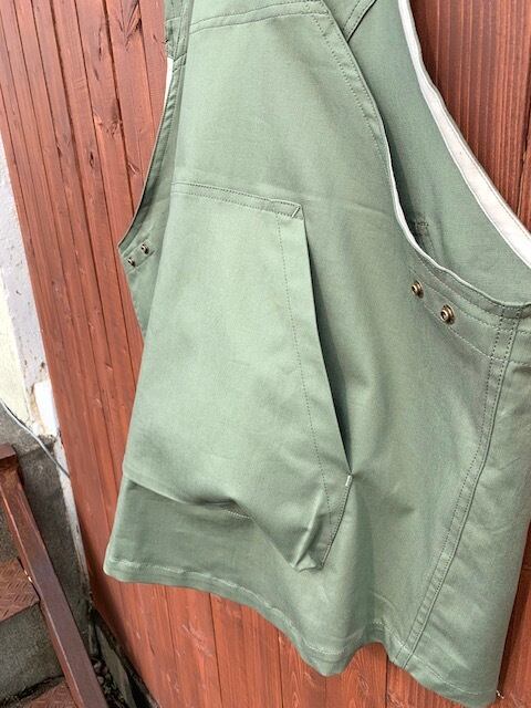 素材はアーミーブロークンストレッチというストレッチの効いた生地。当店では初めての前開きのダブルジップ仕様のBIBです。