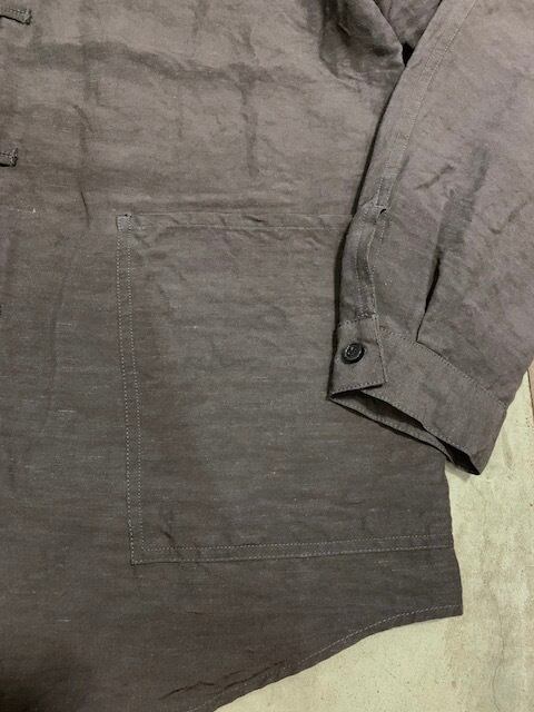 ザラつきのある粗い生地感で、通気性・吸水性・放湿性に優れた素材。夏も着ていただける素材感に仕上がっています。色はINK、スミクロ色ですね。くすんだクロのようなお色です。