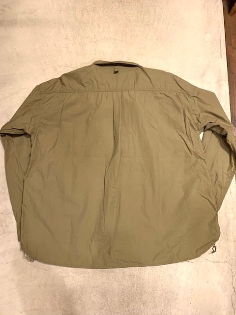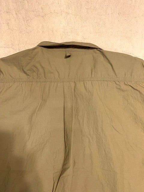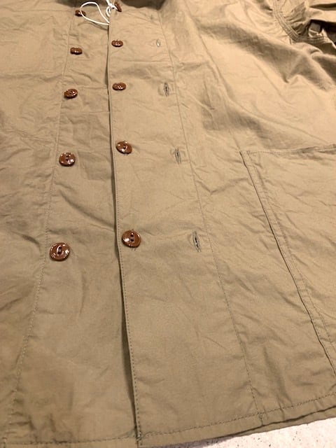 オーガニックコットンを使用したダブルタイプのシャツになります。ボディは乾いた感じのカーキ色で茶色の猫目ボタンとの雰囲気が抜群。生地は少し張りを持たせた感じに仕上がっています。