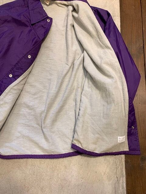 Pla-Jacのナイロンコーチジャケットです。アメリカ製でボディは風合いあるパープル色。古着らしいカラーリングです。バックにはトナカイのイラストがプリントされたインパクトのあるデザイン。裏地は総裏で薄いライナー付きです。