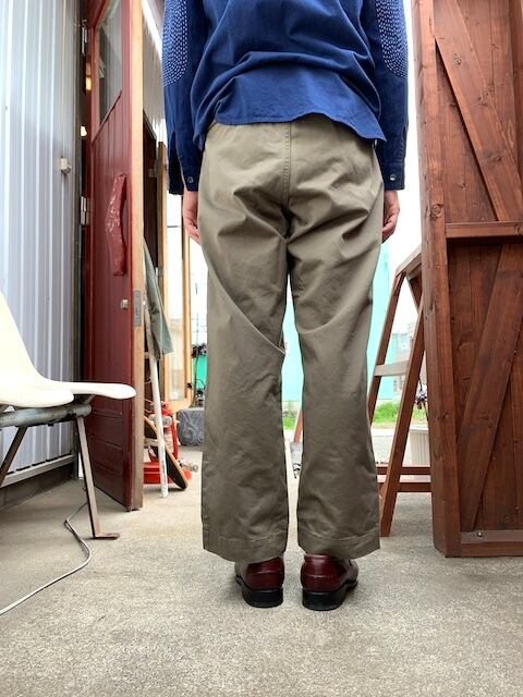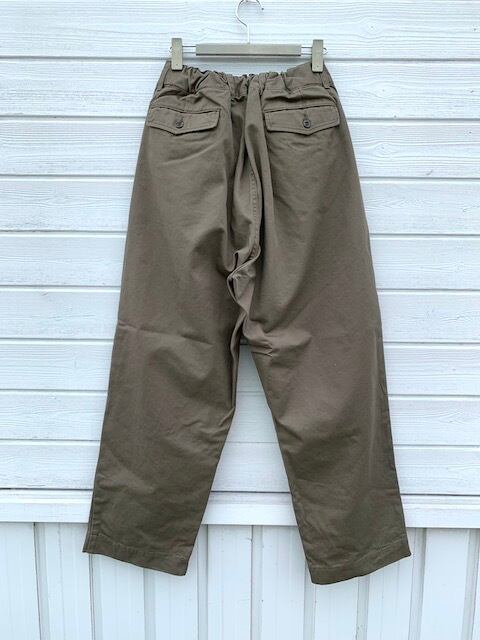 1960年代のフランス軍のチノトラウザーのシルエットをサンプリングした、ワイドシルエットが特徴的なパンツ。新型はウエストのリベットフックが1つになり、ジップ仕様に変更されています。後ろは変わらずゴム仕様でベルトループも完備。男性・女性、体型を選ばず楽に穿いていただけます。