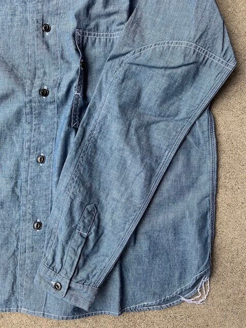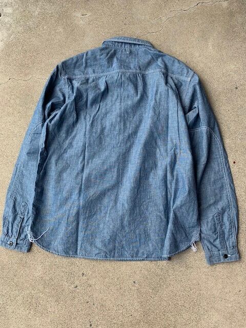 そんな定番アイテムを今作はヴィンテージ感のあるシャンブレー素材を使い製作。最初のどこか渇いた色味・風合いももちろんですが、経年変化の楽しみな素材感のシャンブレーとなっています。一年中着回しの効くシャンブレーシャツ。飽きのこない着やすいシルエットという点も大事なポイントです。