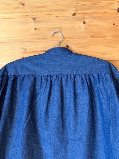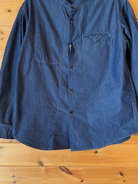 スタンドカラーのユニセックスワークシャツです。程よい厚みを持ちつつ光沢感のあるインディゴ色の生地となっております。ゆとりを持たせた身幅で裾に向かって前立てを徐々に広げたAラインのシルエット。背中もヨーク下にギャザーをとり、ふんわりとした形を作っています。