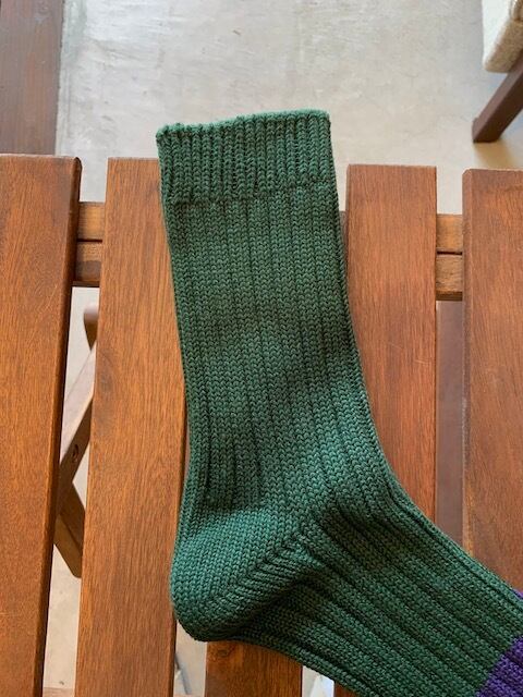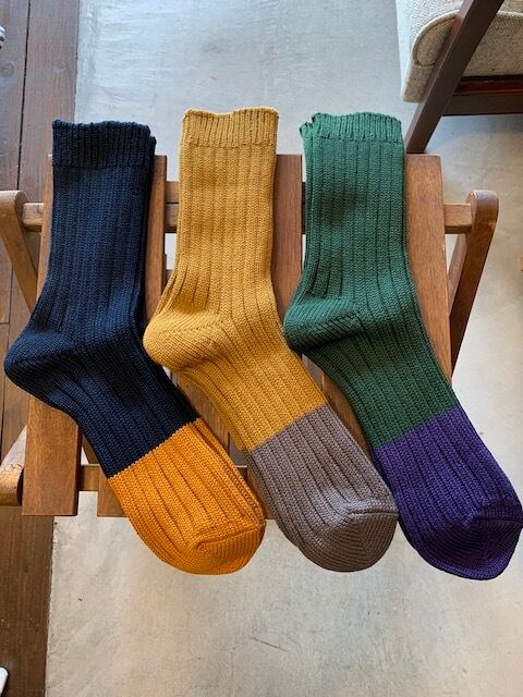 柔らかい綿糸で編み立てた厚手のソックスです。厚さのあるソックスがお好きな方はこのメトロソックスがオススメです。足の甲の切り替えがポイント。バイカラーでカワイイ雰囲気です。カジュアルな装いに使って頂きたいアイテムです。