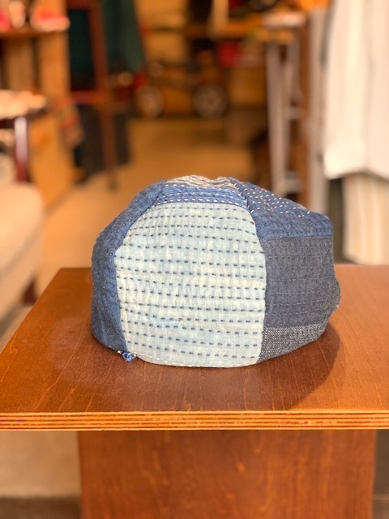 生地を幾重にも重ねて刺し子・パッチワークし、独自のBORO加工を施したワークベレーキャップ。どこからどう見ても古布にしか見えないのですが、これはデザイナー百田氏の技術によるもの。長い時間と手間をかけて作られているのがアイテムを見ていると伝わってきます。生地の組み合わせのバランスの良さが流石な一品です。ゆったりとしたクラウンとなっているので、重心を動かしいろいろなスタイリングが可能です。