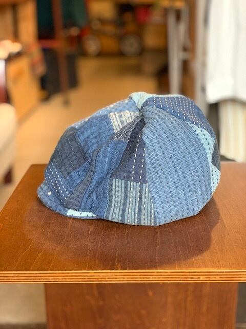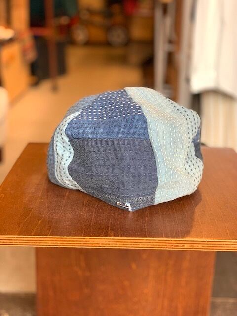生地を幾重にも重ねて刺し子・パッチワークし、独自のBORO加工を施したワークベレーキャップ。どこからどう見ても古布にしか見えないのですが、これはデザイナー百田氏の技術によるもの。長い時間と手間をかけて作られているのがアイテムを見ていると伝わってきます。生地の組み合わせのバランスの良さが流石な一品です。ゆったりとしたクラウンとなっているので、重心を動かしいろいろなスタイリングが可能です。