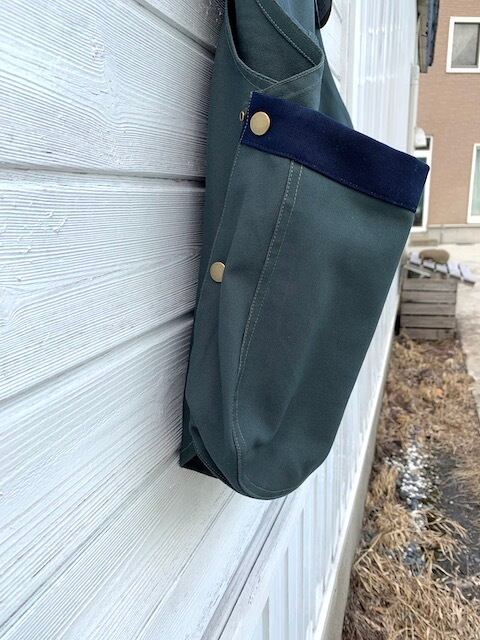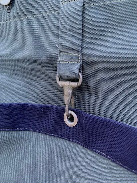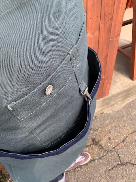 フランス軍のヴィンテージパーツ(ナス管)を留め具に使い、グッと引き締まった雰囲気があります。このナス管、身頃の中央とポケットを繋いでいて大きな荷物を入れてもポケット口が開き過ぎず、物が落ちないように設計されています。