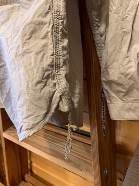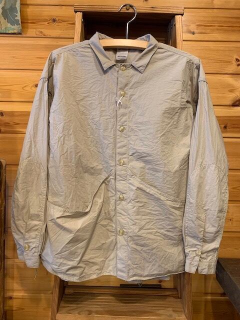 3本針ステッチによる縫製や空環仕上げ、袖から連続してエルボーパッチのようなディテールを備えていたりとワークウェア仕立てですが、品名=スモックのとおり、シルエットも手伝いどこか子供っぽさが残るシャツ。
