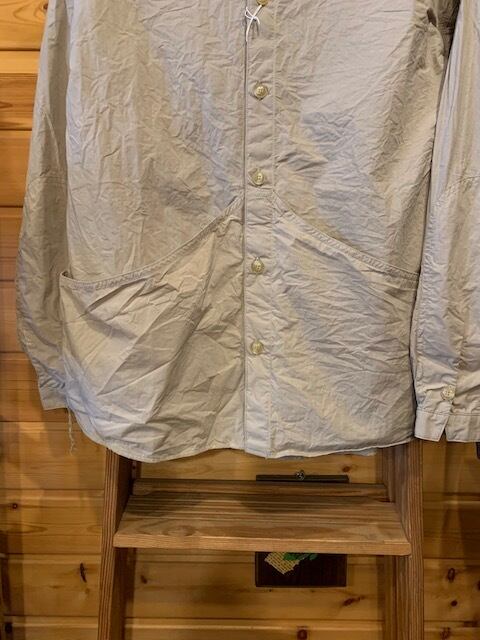 作りはお腹周りのビッグポケット、ドロップショルダーでAライン、首回りがゆるく台襟のない身ごろに直接ついた小さな襟、短めの着丈、タップリと広がる後ろ身ごろ、腕まくり前提のカフボタンのない袖など、特長的なデザインが満載です。