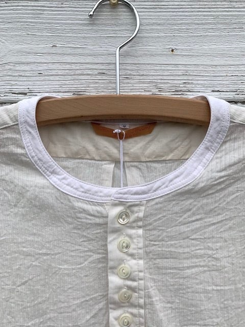 シャツ地でありながら、ヘンリーネックのTシャツのようなデザインで、被りの深さと詰まったボタンの並びも特徴的です。