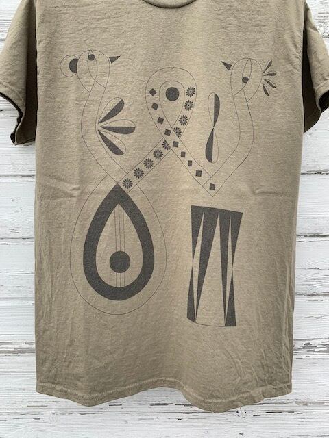 フロントは民族楽器と鳥をモチーフに有効を表したシンボルマーク、バックの首元はスタッフTシャツにも使用されたフォークツアーロゴがデザインされています。