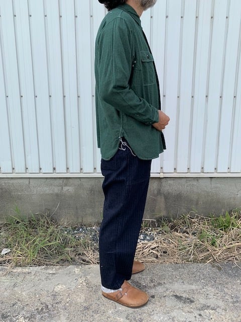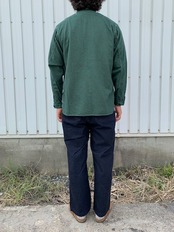 柔らかなコットンのフランネル生地に、白ステッチを浮かすことで雰囲気のある仕上がり。overdyeのグリーンがとても良い色味になっています。