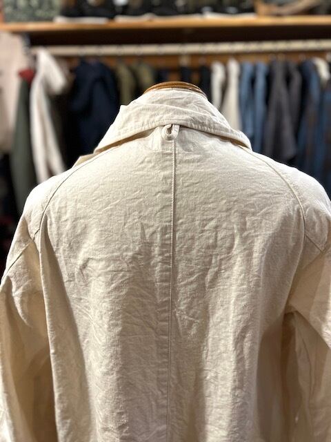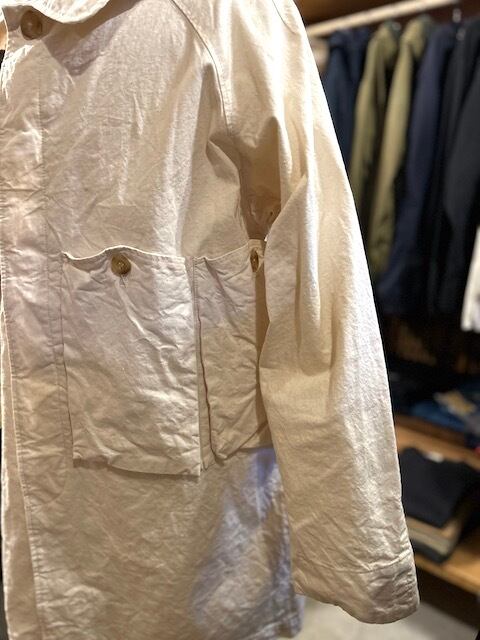 イギリスの森林委員会と環境省により発足された特別監視団体 RFO。支給されたRiver Runs Jacketは厚手のニットの上でも着られるように身幅が大きく取られていました。ただ冬時季、特に早朝は寒さがきついためジャケットの上からでも羽織れるコートが支給されるようになります。それが、主に監視任務外に着用されていたRIVER RUNS OVER。グローブを装着したままでも扱いやすいボタンと大きなポケットに風よけのチンストラップ。ゆったり目のシルエットに加え、裾のプリーツなど動いやすさにも定評がありました。